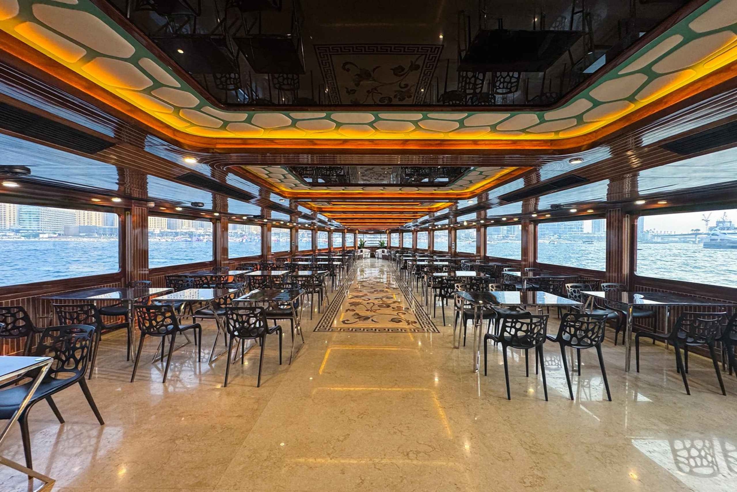 Sube a un megayate y zarpa desde Yas Marina. Disfruta de una cena buffet con cocina internacional y refrescos, o pásate a un ticket VIP para tener una mesa reservada en la cubierta superior, puestos de cocina en vivo, champán y canapés servidos en la mesa. Disfruta de las vistas de Yas Bay, Ferrari World, el circuito de Fórmula 1, Aldar HQ y la isla de Samaliyah. Disfruta de entretenimiento en directo, incluidas actuaciones de danza tradicional. Relájate en un yate con capacidad para 400 personas y varias cubiertas. Es la primera experiencia de este tipo en Abu Dabi y ofrece una forma única de ver los monumentos de la ciudad sin obstáculos desde el mar.Includes