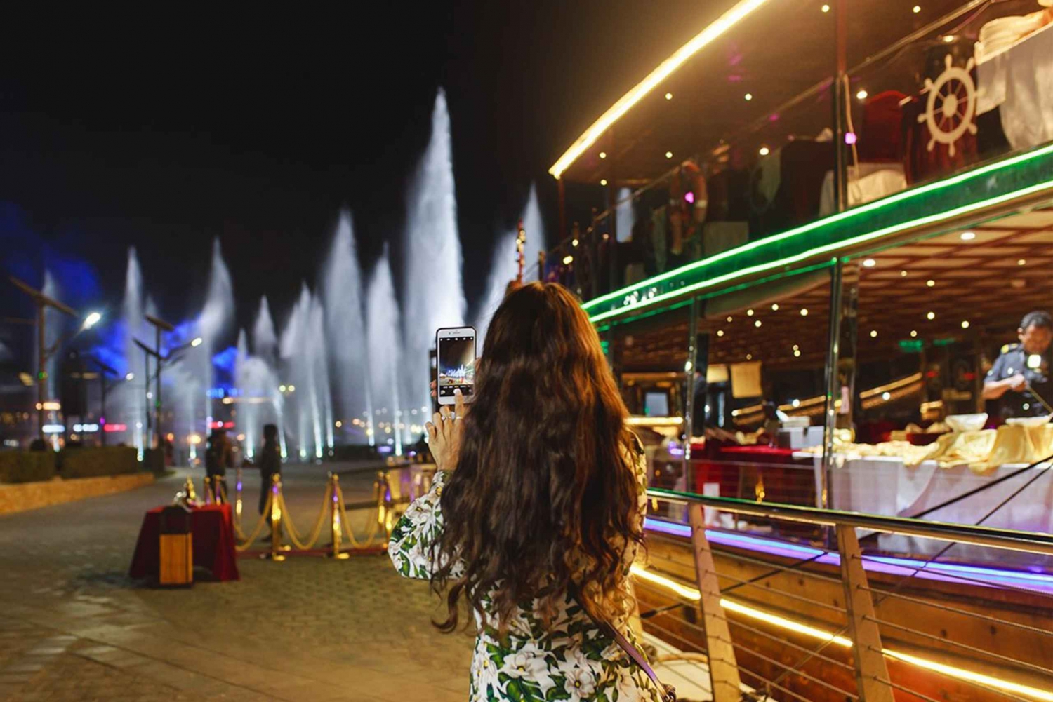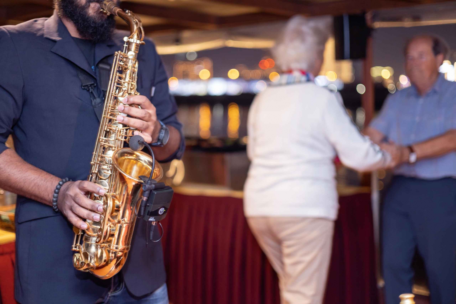 Experience Dubai from the Dubai Water Canal on a sightseeing dinner cruise. Be transferred to a glass-encased dhow for a delicious buffet and admire landmarks, such as Dubai Festival City Mall and the Burj Khalifa. Get a welcome kahwah (Arabic coffee) on arrival followed by an assortment of chilled refreshments and dates. Then, be escorted to your table to enjoy welcome drinks. Start to feel the gentle sway of the waves and romance of the boat as you set sail. Awaken your senses as you gently cruise down the artificial canal. Experience the city's bustling atmosphere as you pass through the Business Bay area while soothing Arabic music serenades you along the way. Marvel at iconic attractions of the Dubai skyline, such as the Business Bay Bridge, Dubai Festival City Mall, Burj Khalifa, Dubai Water Canal Bridge, JW Marquis Hotel, and Westin Hotel. Indulge yourself with a sumptuous feast of Arabic appetizers, grilled meat, fresh salads, and delicious sweets from Arabia, along with hot beverages. Be mesmerized by the saxophone performance.