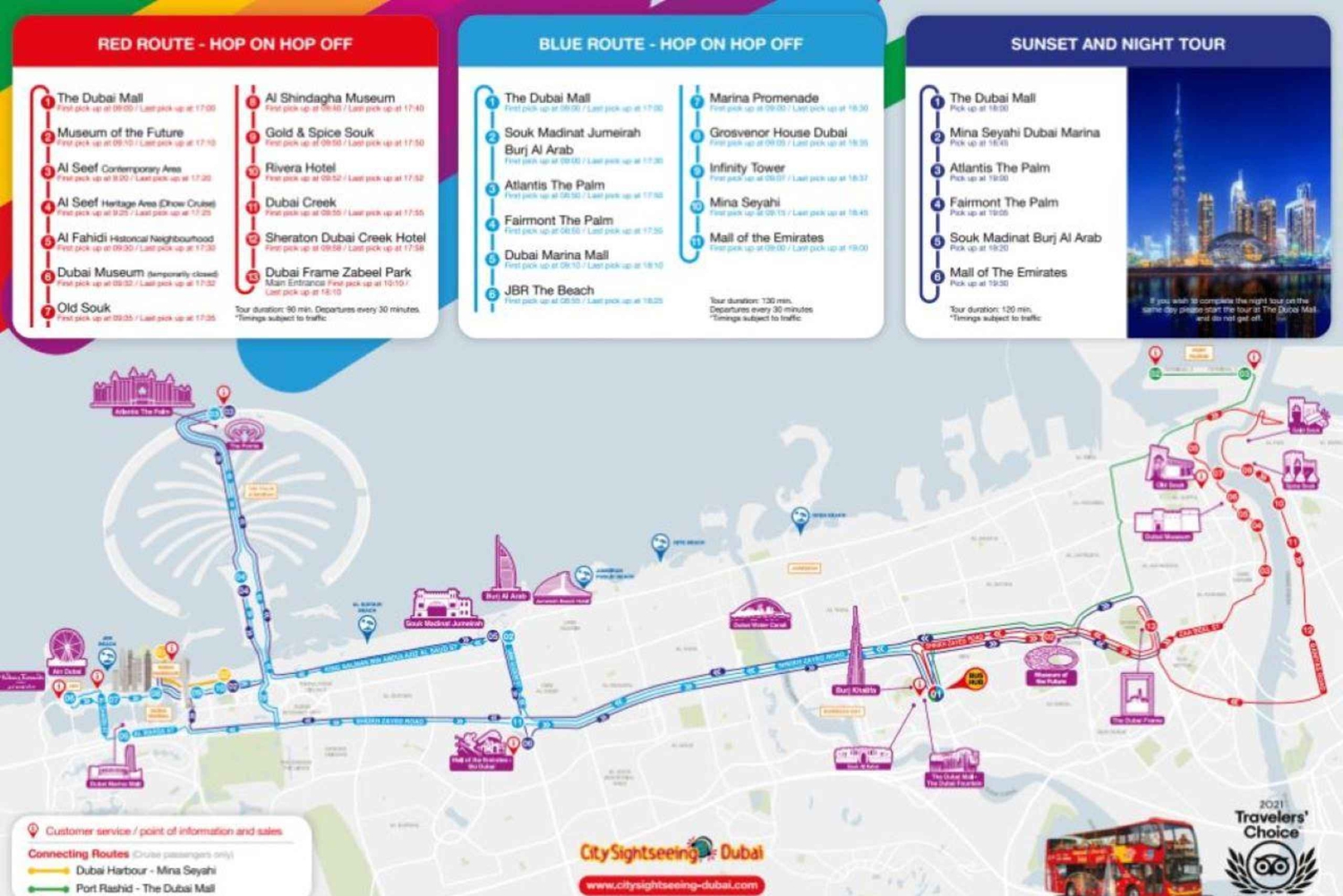 - - Percorso rosso di Abu Dhabi: Prima partenza dalla fermata 1 alle 9:00. Ultima partenza dalla fermata 1 alle 17:00. Durata del tour: 90 minuti. Frequenza: Gli autobus passano ogni 30 minuti - Percorso blu di Abu Dhabi: Prima partenza dalla fermata 1 alle 10:00. Ultima partenza dalla fermata 1 alle 16:00. Durata del tour: 120 minuti. Frequenza: Gli autobus passano ogni 120 minuti - Percorso rosso di Dubai: Prima partenza dalla fermata 1 alle 9.00. Ultima partenza dalla fermata 1 alle 17.00. Durata del tour: 80 minuti. Frequenza: Gli autobus passano ogni 30 minuti - Percorso blu di Dubai: Prima partenza dalla fermata 1 alle 9:00. Ultima partenza dalla fermata 1 alle 17:00. Durata del tour: 130 minuti. Frequenza: Gli autobus passano ogni 30 minuti - Tour serale e del tramonto (Dubai): Questo non è un tour Hop-on Hop-off. C'è un solo giro al giorno. Il tour dura 2 ore. Orari di prelievo: Fermata 1 alle 18:00, Fermata 2 alle 18:45, Fermata 3 alle 19:00, Fermata 4 alle 19:05, Fermata 5 alle 19:20, Fermata 6 alle 19:30. - Nota bene: il trasferimento tra Abu Dhabi e Dubai non è incluso nel biglietto.