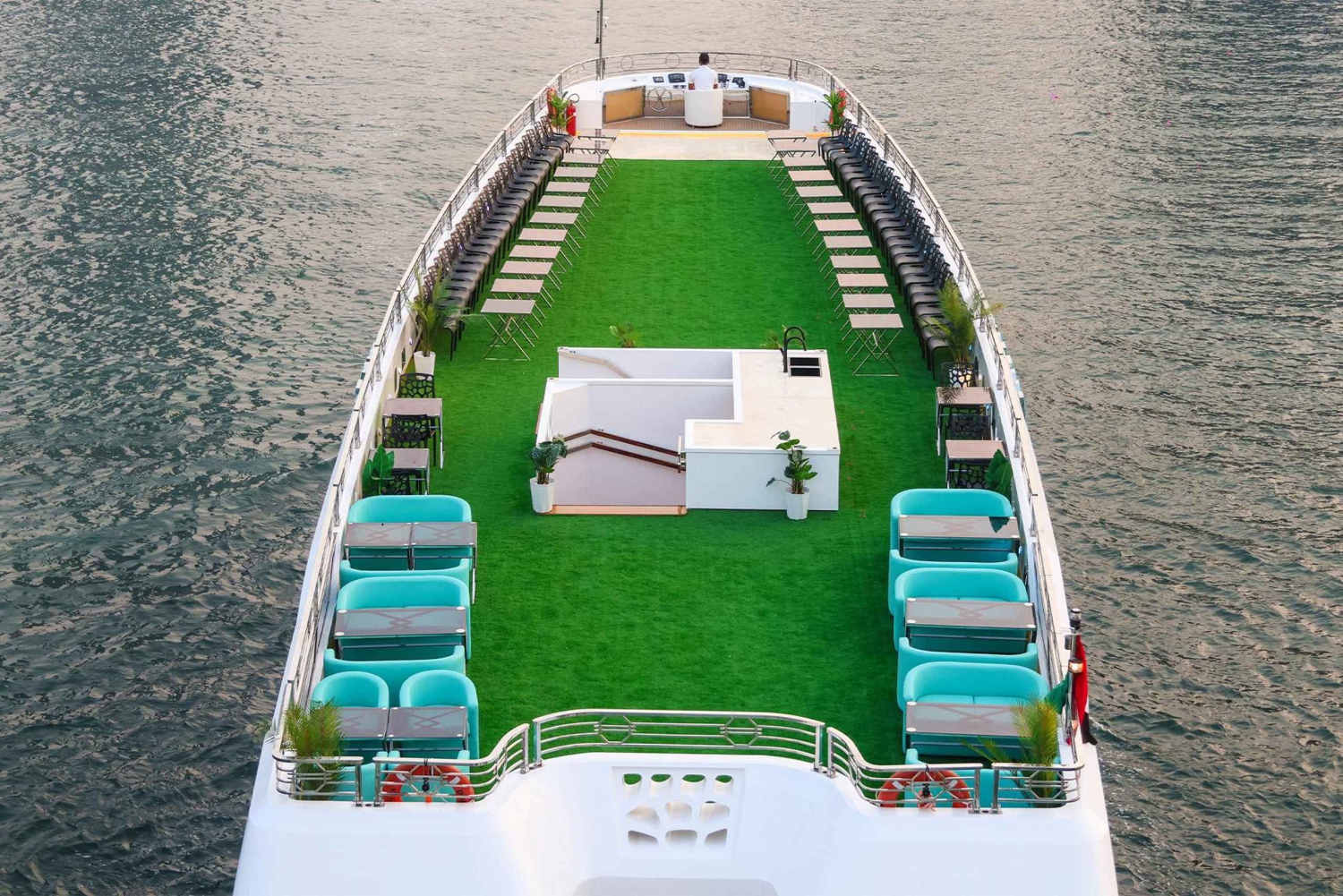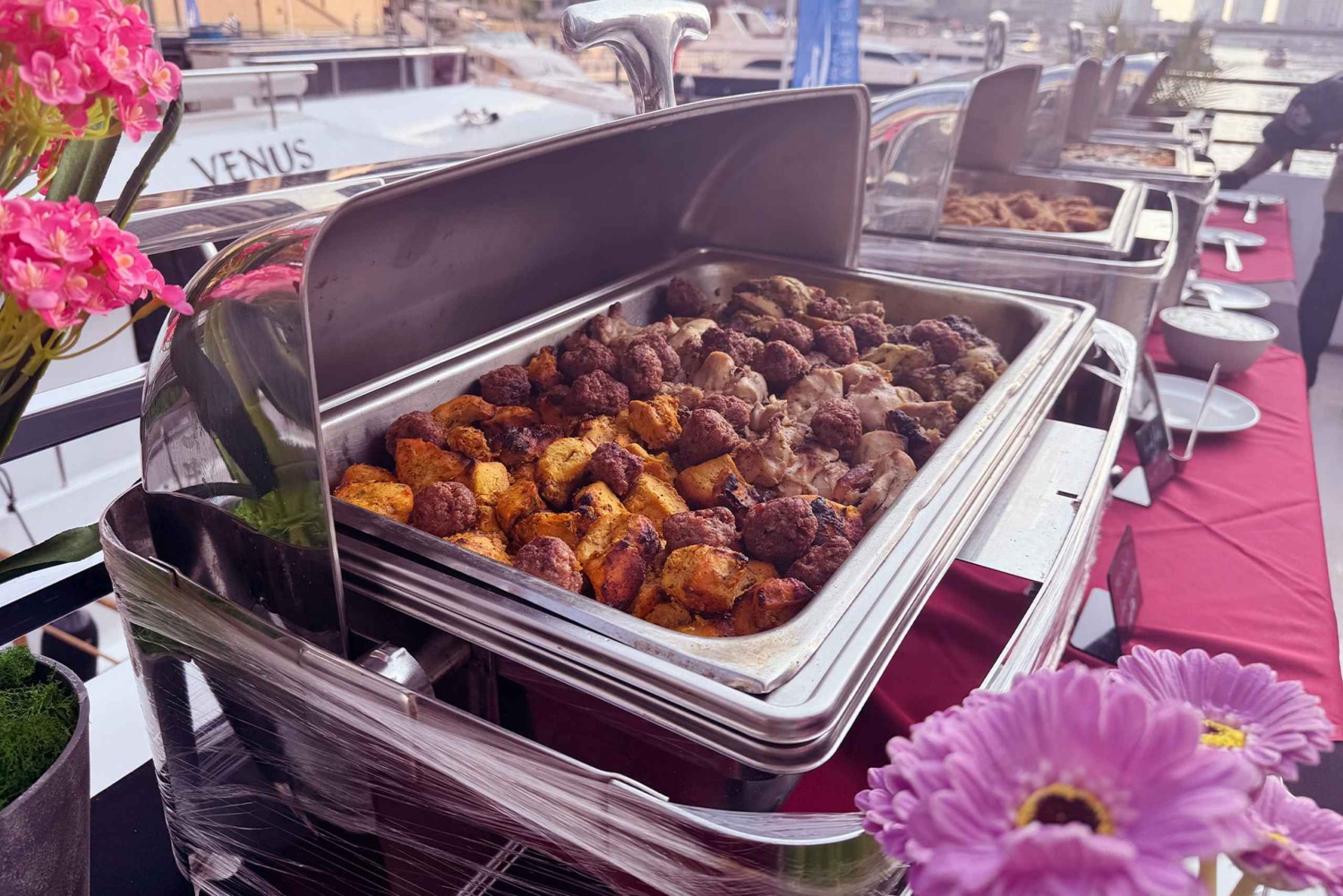 Gå ombord på en megayacht och sätt segel från Yas Marina. Njut av en middagsbuffé med internationella rätter och läsk, eller uppgradera till en VIP-biljett för ett reserverat bord på övre däck, live matlagningsstationer, bubbel och kanapéer som serveras vid bordet. Njut av utsikten över Yas Bay, Ferrari World, F1-banan, Aldar HQ och Samaliyah Island. Njut av liveunderhållning, inklusive traditionella dansföreställningar. Koppla av på en yacht med plats för 400 gäster och flera däck. Detta är den första upplevelsen av sitt slag i Abu Dhabi, som erbjuder ett unikt sätt att se stadens landmärken obehindrat från havet.Includes